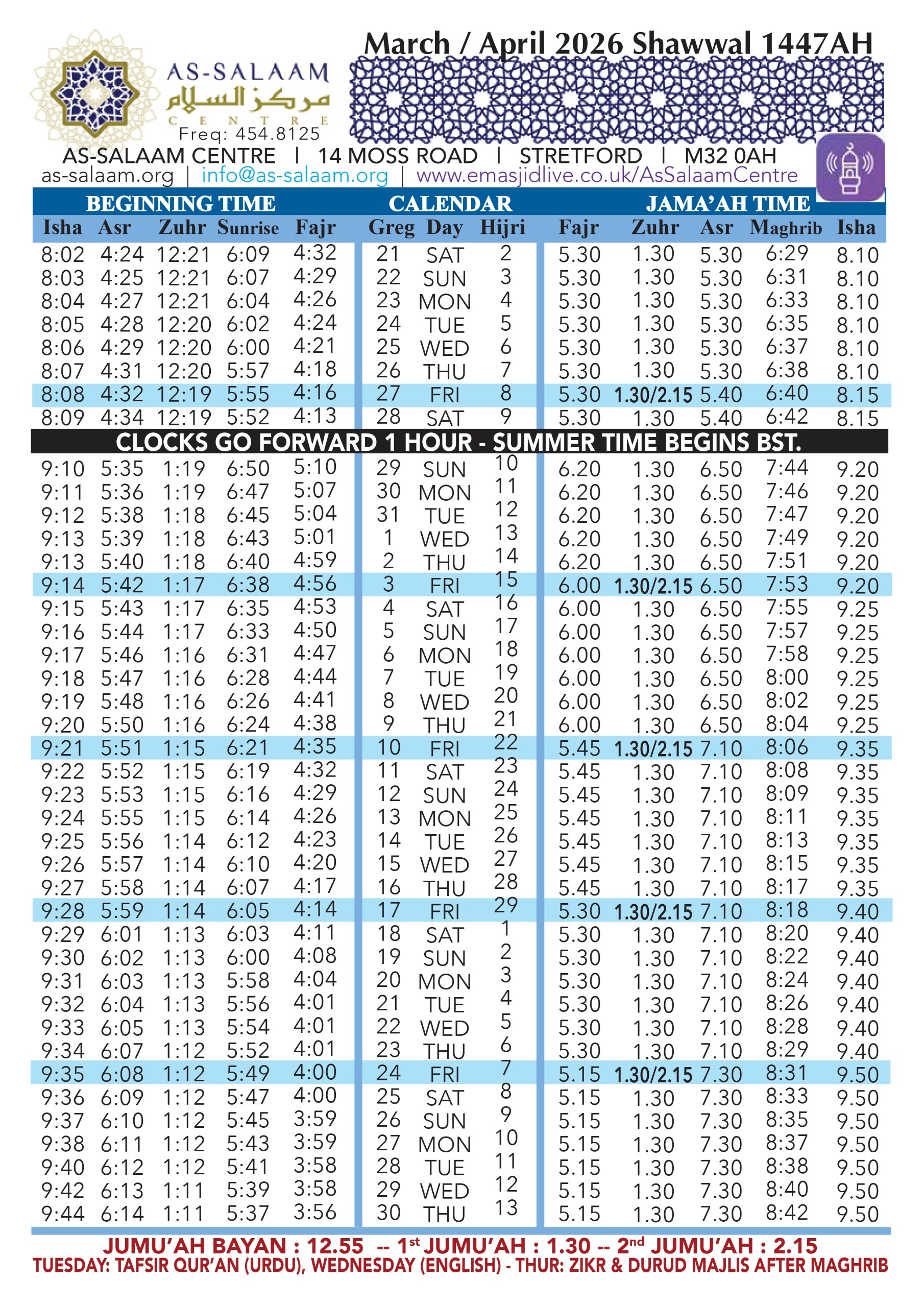 As-Salaam Centre is located at 14 Moss Road, Stretford, Manchester. We provide a welcoming space for worship, Islamic education through our Madrasah, community events, and charitable services. Our mission is to nurture faith, foster community bonds, and serve all people with compassion and excellence.